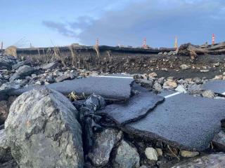 State Investment: The State has similarly invested heavily in protective measures and emergency repairs to keep the road operational. In 1982, DOT&PF executed an emergency repair using unreinforced concrete block revetment after a storm damaged protective sheet pile wall and riprap armor and destroyed a portion of the road. DOT&PF later armored the highway in two additional emergency revetment projects to address downdrift erosion caused by the federal revetment. By 2007, the State had spent more than $6 million on repairs and protection measures over a 20-year period. These armored areas require ongoing maintenance due to periodic overtopping that damages roadway shoulders. The November 2024 storm surge washed away substantial portions of road right-of-way and collapsed one lane of Alaska Highway 1—prompting over $3M in temporary repairs and protection measures.