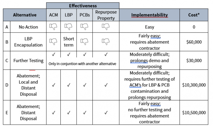 Alternative D was determined the best option for meeting community’s objectives of removing hazardous materials and repurposing the property.
